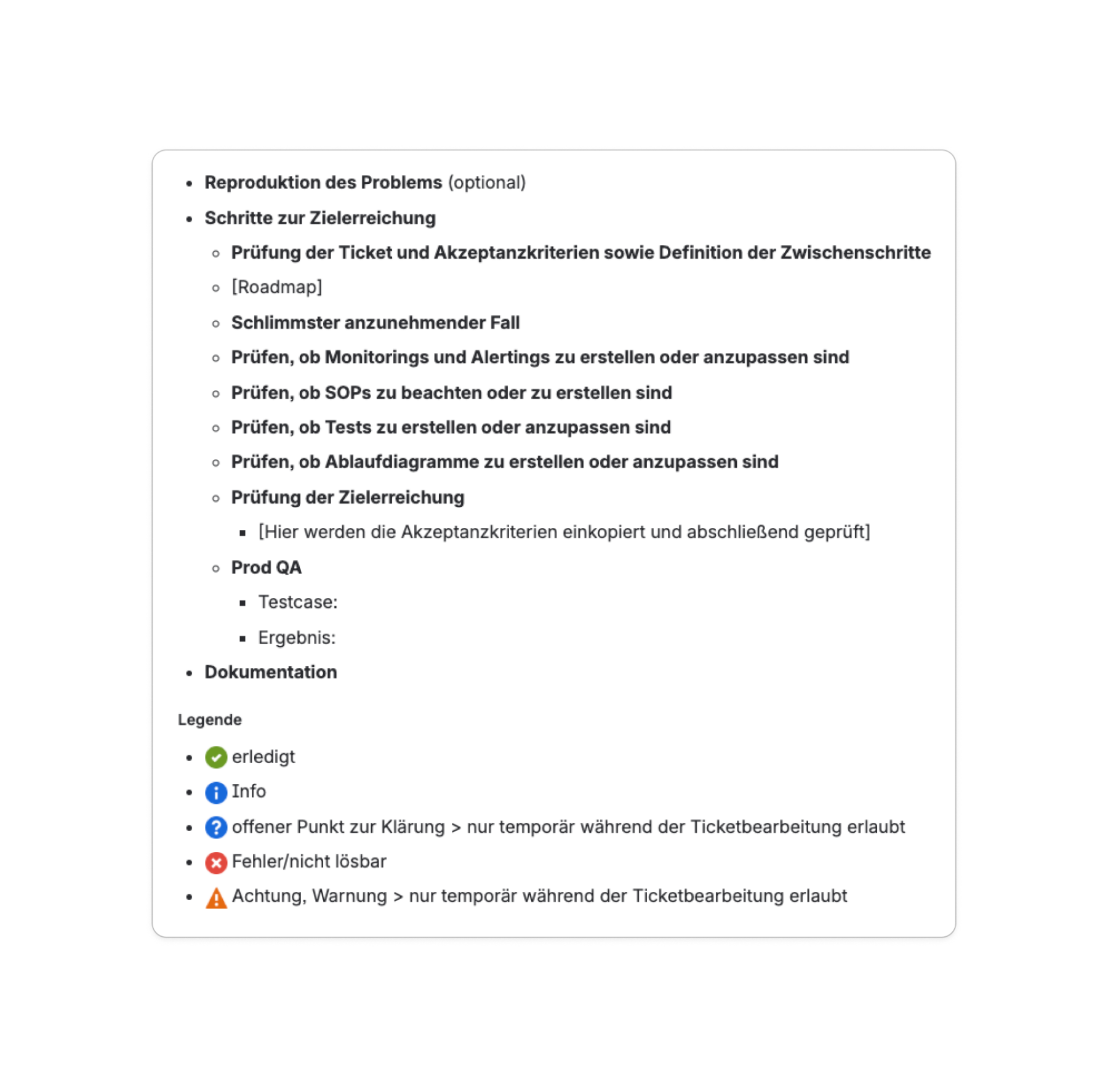 Die Fahrplan-Struktur ist für alle Ticketarten (Bug, Hotfix, Hottask, Task und Story) gleich. Das ist wichtig, um Konsistenz und Einheitlichkeit zu erreichen und sicherzustellen, dass auch bei kleinen Tasks – die typischen „ich mach das mal schnell“-Aufgaben – nichts vergessen wird.